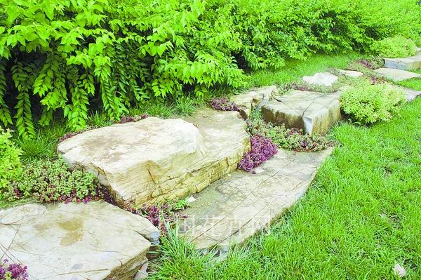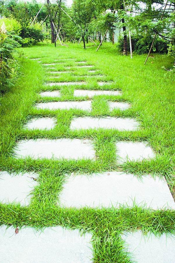 ▲用草皮镶嵌的花岗岩汀步