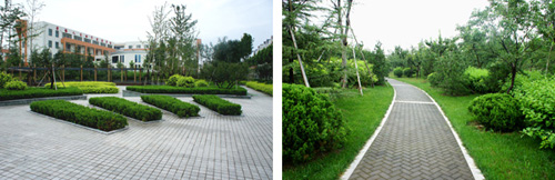 而在道路十字路口的节点处,则主要是用10cm×10cm的小花岗岩铺地,铺出来的路面整洁、平坦,看似简单,实则对施工技术要求相当高。草坪中的地面铺装,则采用花岗岩汀步,用错缝铺装法,两块花岗岩之间用草皮镶嵌,就像给每块花岗岩镶了一道绿边,与旁边的草坪和谐地融为一体。贯穿整个工程的游憩步道,全部采用“人字形”的铺装方法,中间用透水砖、两边以花岗岩镶边,透水砖价格不高,用以镶边的花岗岩是利用了铺装中剩余的边料,虽然用料简单,但通过对技术的严格要求,铺出的路面却整洁而不失韵味,是一种实用、环保、节约的做法。