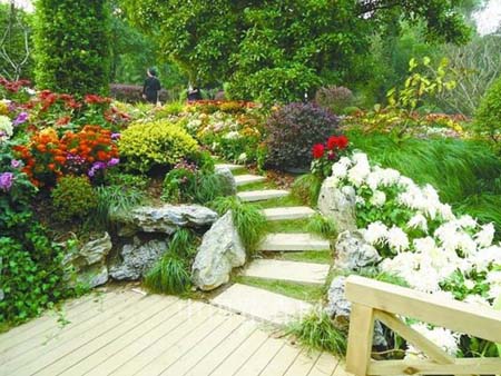 这片铺满白色石子的空地,有日本枯山水庭院的感觉,更重要的是,它是孩子们的最爱,一个个活泼可爱的孩子走到这里时总要尽情地蹦上几下,或者蹲下去把玩小石子,开心的笑容,让留恋花间的蝴蝶也黯然失色。可爱的孩子、洁白的石子、红色的景墙、灿烂的花卉,这种温馨的画面唯有在自家的庭院里,才会这样的无拘无束。