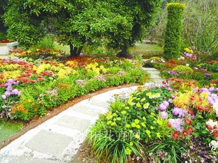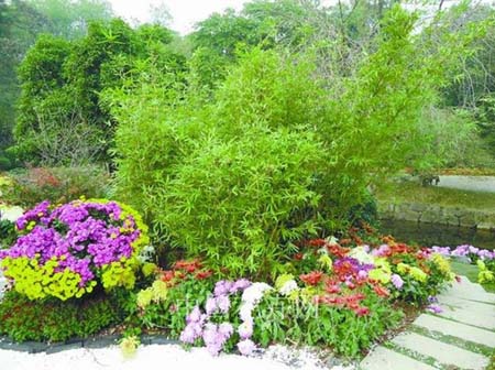 《绿庐》面积只有约400平方米,但植物配置极为丰富,在充分利用原有的桂花、樱花、罗汉松、竹子等植物的基础上,又加入了彩叶冬青、厚皮香、银霜女贞、红叶扶桑、龟甲冬青、红花檵木、美人蕉、兰花三七、沿阶草、金边胡颓子等几十种植物与菊花相配置,形成了色彩绚丽、层次饱满、清新雅致的庭院景观。“这次应用的菊花品种有二、三十种,主要有绿牡丹、春日见山、金龙腾云、白万胜、红切花、红衣锦绣……颜色有红、绿、粉、紫、黄等,通过不同的配植手法,营造出五彩斑斓、生机无限、高洁清雅的美景,让人丝毫感觉不到秋之凋零,反而像是畅游春之繁花胜景。”该负责人笑着说。
