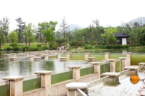 施工技术的创新以沉水廊道为代表。沉水廊道总长148米,是中国目前最长的廊道景观,工程量大,施工条件复杂,面对的技术难题多。施工的最大难点是廊道防渗排水、基础沉降及廊体抗浮处理等技术环节。通过技术团队的多次攻关,最终解决了廊道不沉降、廊道结构稳定、结构防水等问题,形成了独具特色的长廊技术施工特色。