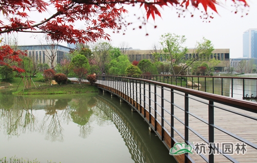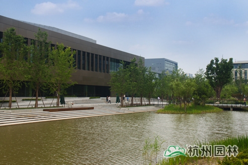 从滨江区江虹路的西入口处走进华为杭州生产基地,首先映入眼帘的是广场上大小不一的花池,一棵棵银杏、香樟、桂花生长得郁郁葱葱,昭示着无限的生机与活力。脚下的铺装,一边是菠萝格防腐木,一边是规则的花岗岩,一“软”一“硬”,相映成趣,蜿蜒延伸,直通前方的人工湖。清澈的湖水,在夏日阳光的照耀下,波光粼粼,偶尔一阵风来,一圈圈的涟漪荡漾,整个湖面都动了起来,让人忍不住加快脚步,去一睹前方的美景。这就是华为杭州二期生产基地景观绿化分包工程一标段的现场景观,该工程由乐动平台_乐动(中国)一站式服务平台 承建,曾荣获2013年度浙江省园林绿化工程安全文明施工标化工地。