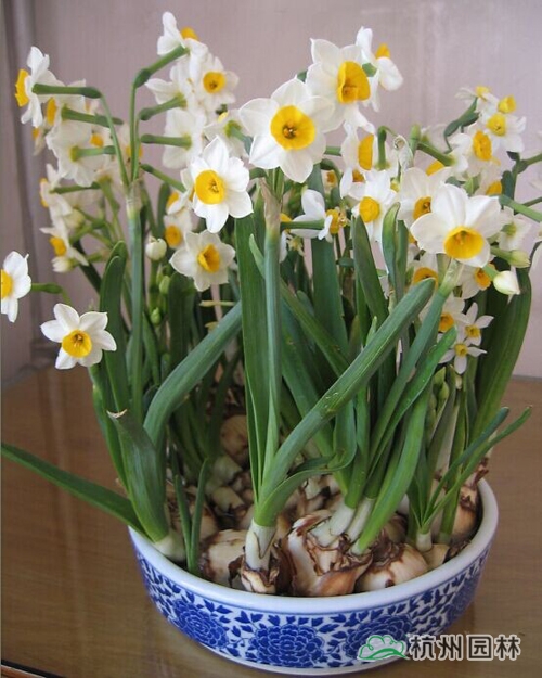 水仙:水仙是冬季常见的花卉之一,通常种植的水仙是指中国水仙,其姿态玲珑可人,清香扑鼻,在寒冬腊月可开花;而洋水仙一般在春季开花,色彩艳丽,形态壮美,但大多缺乏香味,两者各具特色。但是,无论中国水仙还是洋水仙,种球的优劣决定着花的质量,因此,在选购种球时要挑个大、硬实、侧芽少的种球。中国水仙有土培和水培两种种植方法,水培法即将催芽处理后的水仙种球直立放入浅盆中,加水淹没鳞茎三分之一为宜,盆中以玻璃球、鹅卵石等固定。洋水仙不宜用作水培且喜冷凉环境,过于温暖会导致叶片徒长,较喜水,花期时适量增加水分可延长花期。