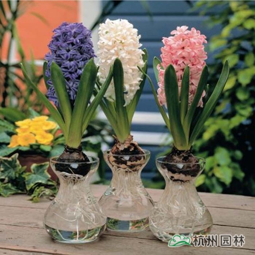 风信子:目前市场上常见的风信子有粉、蓝、玫红、紫、白等品种,其中以蓝、粉、紫最受欢迎。选购时要挑个头大而饱满的,抓在手上硬实偏重,根部不发霉,生长点未受破坏的种球。11月下旬种植,在阴冷的环境下放置两个月左右,这样处理可以减少后期夹箭的概率,也有利于根系的生长,待花芽长至5cm左右时移至光线充足的区域即可。风信子也可水培,但较盆栽一般花箭短、花朵少,花期也会短一周左右。