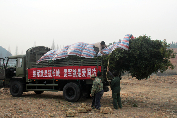 为给官兵营建绿色的生活环境,杭州市政府从杭州市园林绿化工程有限公司位于临安泉口的苗木基地选购了一批桂花树送给驻舟山部队。据悉,此次选购的桂花为蓬径1.8米至3.5米的大苗,品种有四季桂、硬叶丹桂、波叶金桂等。同时,该公司还派出了专业技术人员前往舟山指导种植工作。