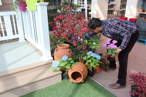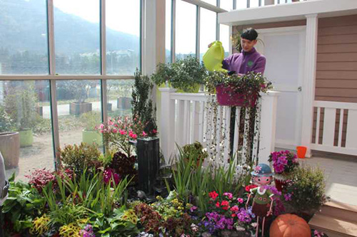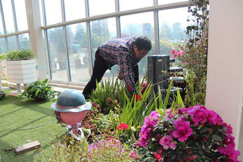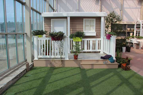 ▲乐动平台_乐动(中国)一站式服务平台 选择园艺中心室内一处小木屋的阳台,作为造景点。园艺师现场查勘后,初步确定花境布置点的面积和风格。