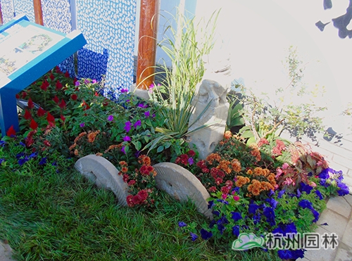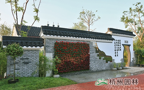 考虑到银川的干燥气候,垂直绿化墙植物的保湿成为难题。“浙江园”垂直绿化墙以无纺布为墙体材料,使用保湿性强的基质,优选植物种类,同时搭配滴灌系统,保证了绿化墙鲜花拥簇的景象。展园内的垂直绿化墙设计简洁、曲线优美,与以钱塘江文化为主题的背景墙相互映衬,共同展现了新时期浙江园林景观的不断发展与创新。