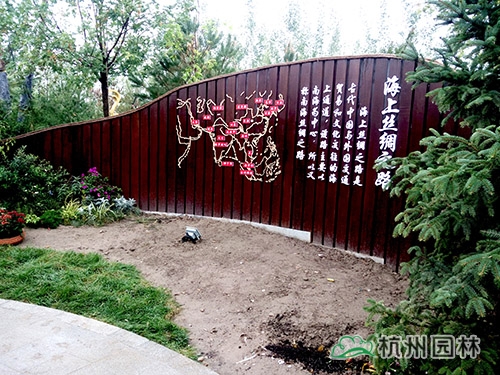 本处已有木制景墙做背景,花境施工前已在几个节点放置了花车、木桶等,并栽植了一棵较高大的红皮云杉,为花境营造创造了良好的条件。结合景墙上的文字、地图,以“陆上丝绸之路”文字为分界点,营造“丝•路”、“丝•念”两组花境。