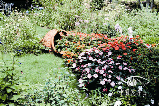 陶罐花溪景观 以冰生溲疏为背景,通过陶罐的配置,组合搭配超级凤仙‘桑蓓斯’、天竺葵、紫娇花、粉花绣线菊、红花鼠尾草、姬小菊、九头狮子草、大花飞燕草等,形成以红色调为主的陶罐花溪景观。远远望去,仿佛一道绚丽的花海从陶罐中倾泻而出,汩汩地流向远方。
