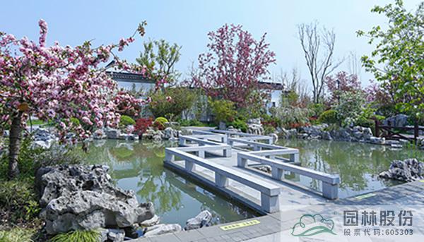 曲折的小桥将园中的水系一分两半,一边是平面的水面,一边是层层跌落的流水,动静结合,意蕴悠远,带给人们更加丰富的景观体验。而不同的植物配置手法,也让海棠显得更加丰姿婥约,优美动人。