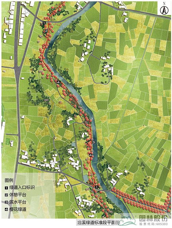 沿溪绿道为樱花环中滨河段落,该标准段长度为730m,总长2590m。以春季樱花为主题,打造浪漫的滨水慢行系统,沿线打造休憩空间,设置休憩设施,并在入口处设计特色标识,成为村民通行休闲健身的浪漫步道。