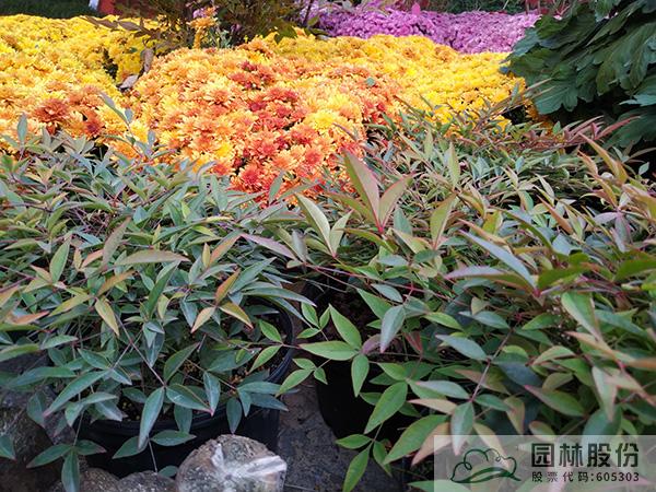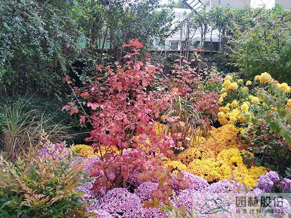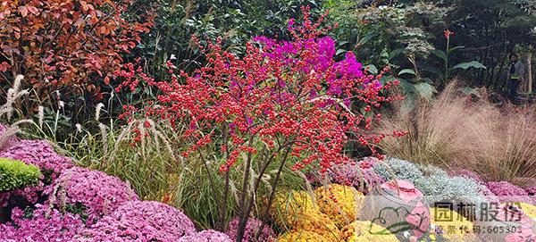 将树型精致的湾流南天竹点植在低矮的高饱和度球菊花丛中,通过色彩与形态的对比,成为视觉焦点。