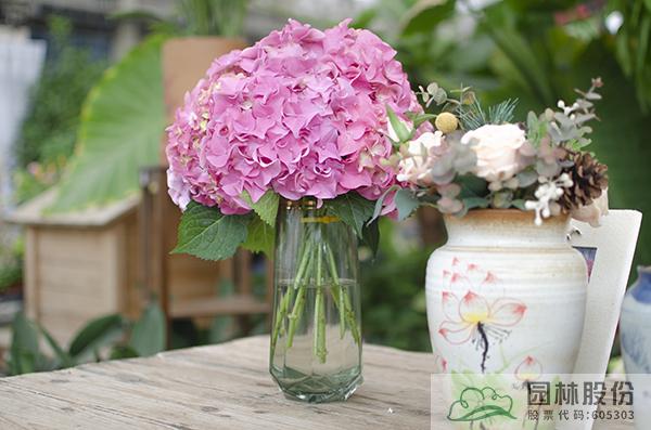 绣球不仅能成为插花的“主角”,花朵硕大、花色艳丽、茎秆强壮的绣球品种,同样非常适合作为鲜切花。如‘倾城之恋’、‘夏日热恋’等,不管是同色系的一枝或几枝,或不同色系的一束,随手插在玻璃瓶里,放在办公桌上、餐桌上、窗台上,都是一道美丽的风景。