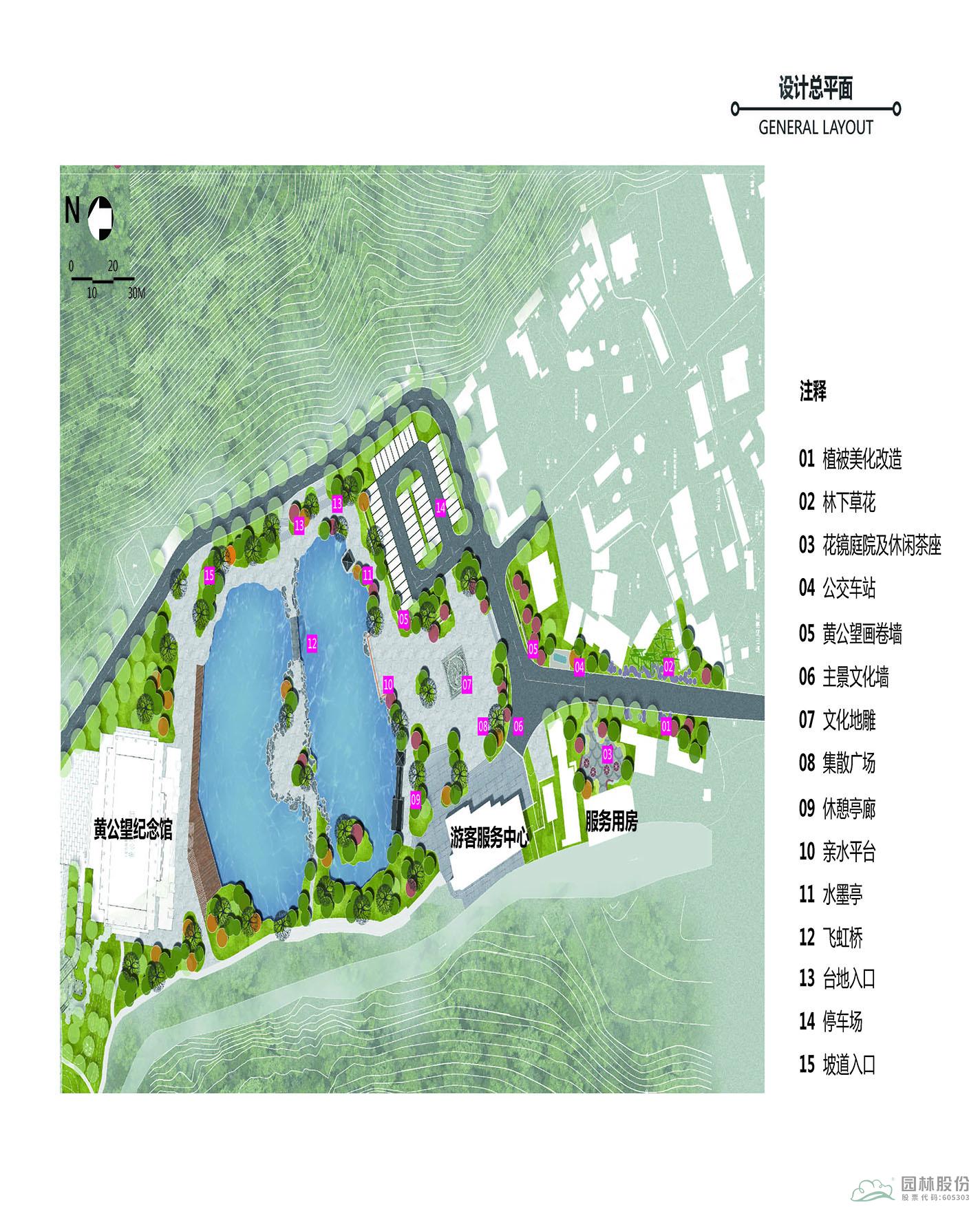 项目位于黄公望隐居地入口,环境清幽,具有极好的生态条件。入口区有黄公望纪念馆和接待中心两处主要功能区,其间有竹林碧谭镶嵌其中。