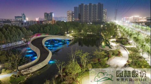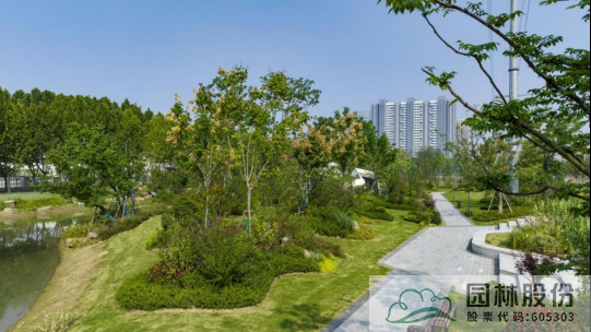 水系贯穿整段绿地,绿道、景观桥穿插其中,沿途设置平台、廊架等,充分呼应水网与路网交织主题。水系驳岸既有草坡入水,又有松木桩驳岸,点缀景石,搭配疏密相间的绿化共同形成了生态多变的生态水岸。