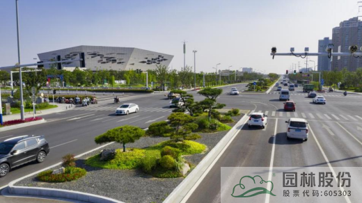 打破原有道路植物种植形式单一,品种较少,冬季落叶草本花卉较多,与道路西侧景观难以呼应的不足,改造后的中央隔离带,在道路两端岛头位置,用国产造型黑松替代性价比不高的日本造型黑松,以造型黑松桩点缀,中间段则采用常绿植物和自然式花境,以大小组团形式进行植物造景,在丰富植物品种和种植手法的同时,满足了冬季景观效果,并能与道路西侧景观有机融合。