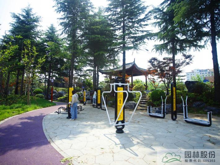 林荫跑道宽 1.5-2m,地面铺彩色沥青,地面为 1200*300*50 厚荔枝面芝麻灰花岗岩地雕,填充部分为字体阴刻 3mm二十四节气及七十二候;为传播中华传统文化,以二十四节气展开名帖、拓印、诗歌等形式的宣传,打造新时代文化客厅,让市民更直观的感受古典文化魅力。对健身场地道路进行石材铺装,安装健身器材;休憩空间进行石材铺装,安装座椅,方便市民休息,打造集休闲游憩、文化体验于一体的绿色活动空间。
