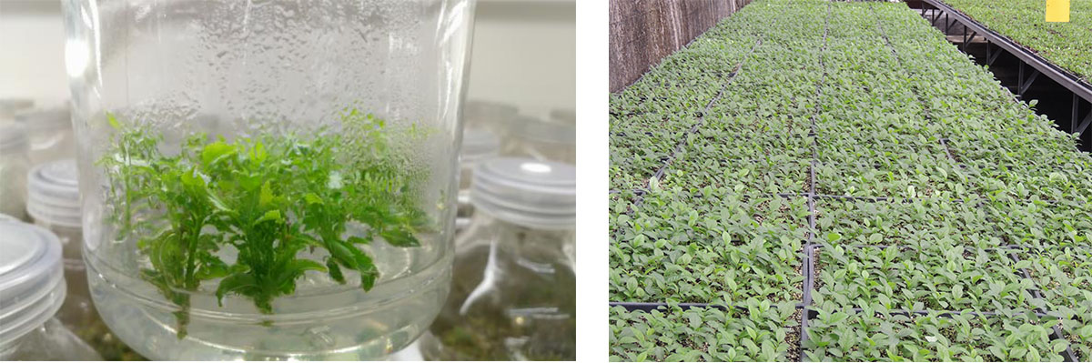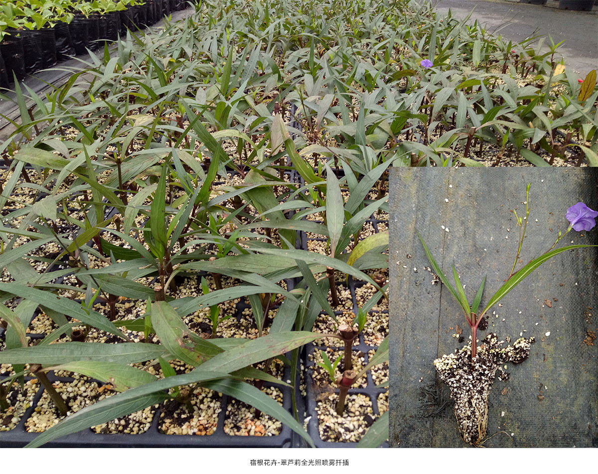 (1)全光照喷雾扦插育苗技术 全光照喷雾扦插技术具有生根期短、成活率高和操作简单等优点。研究院已建立了桂花、冬青、降香黄檀、新优宿根植物等数百种植物的全光照喷雾扦插技术体系,年度育苗量200多万。