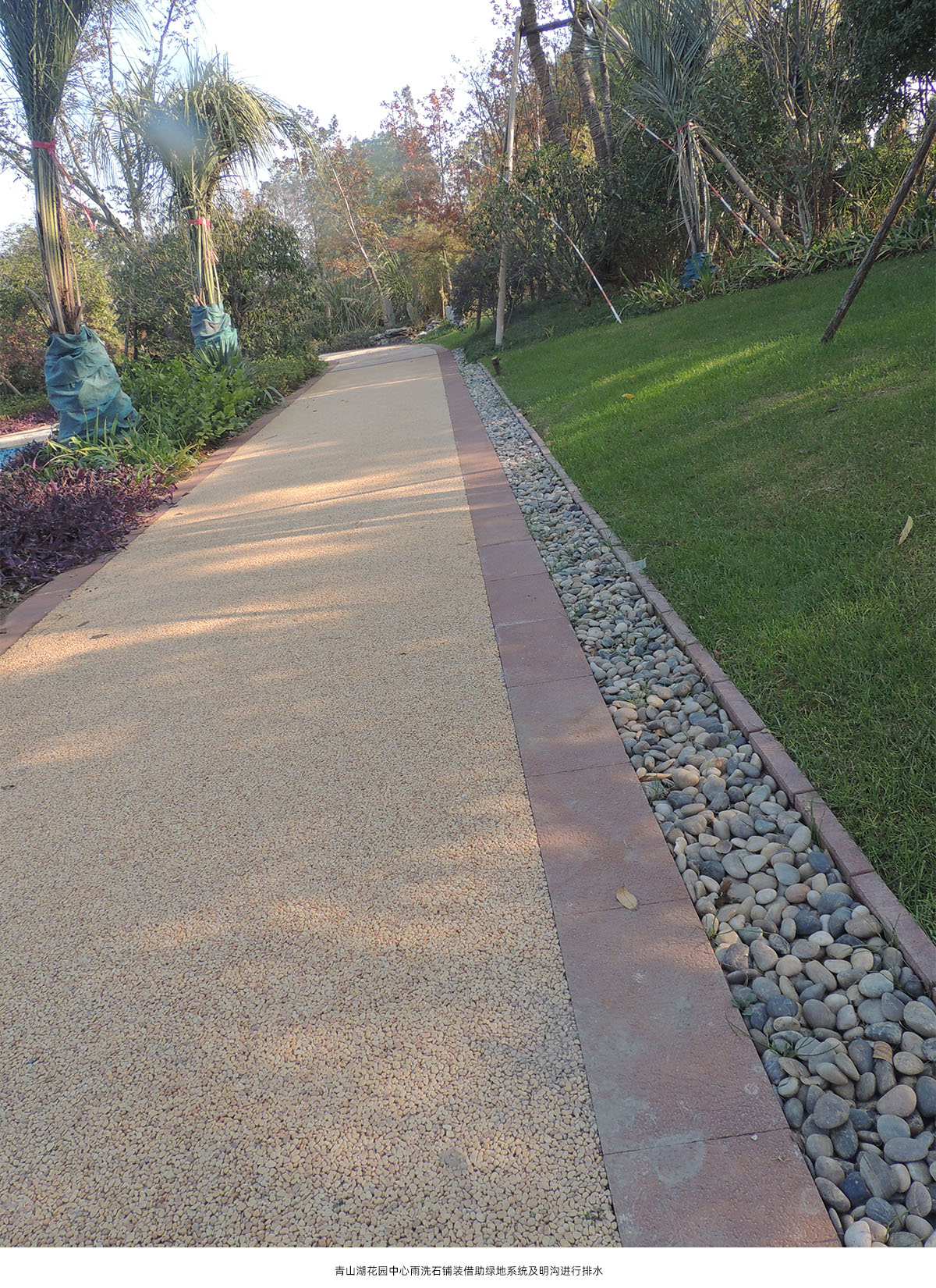 通过对铺装材料透气性、生态性研究及铺装结构层施工工艺改进等措施,结合园林景观地形处理、设置排水设施等手段,建立生态型铺装体系。